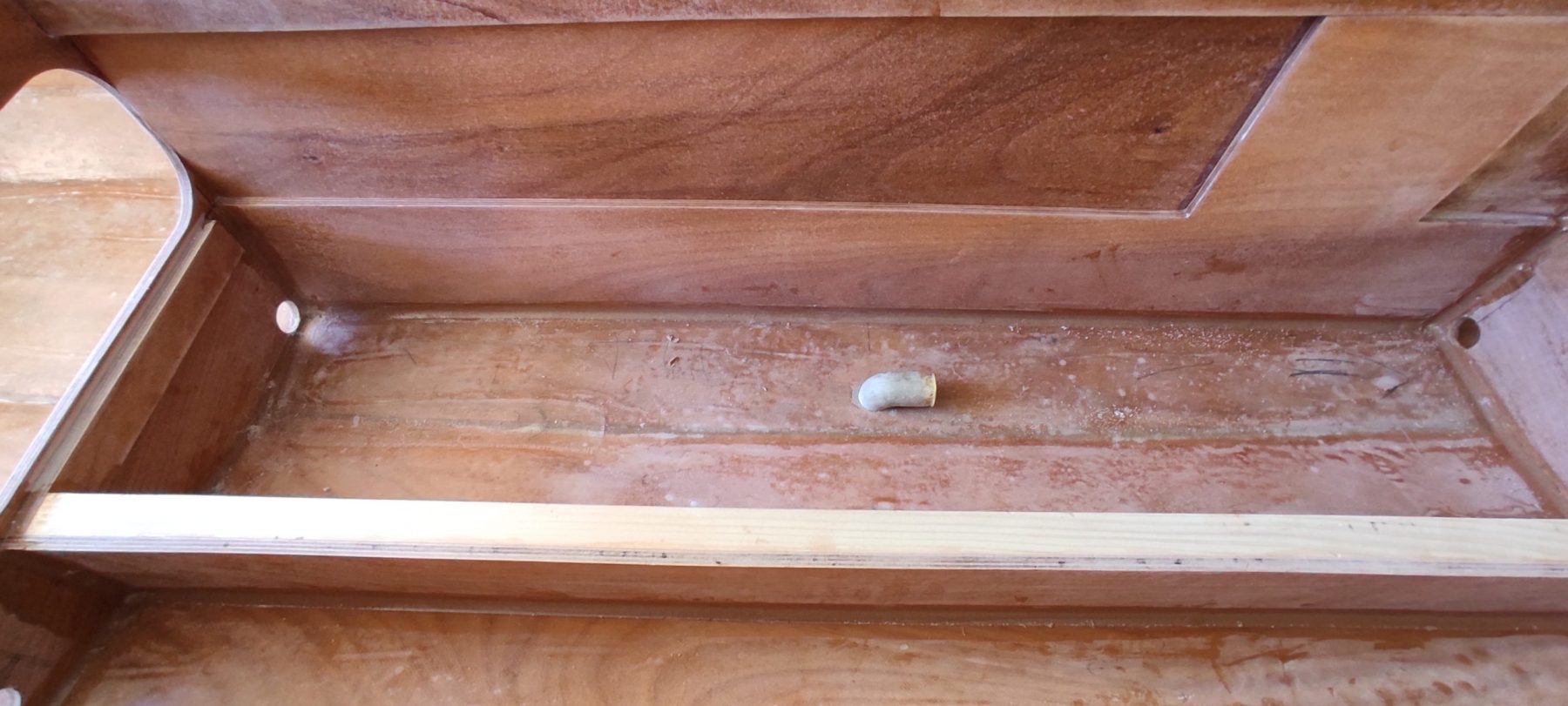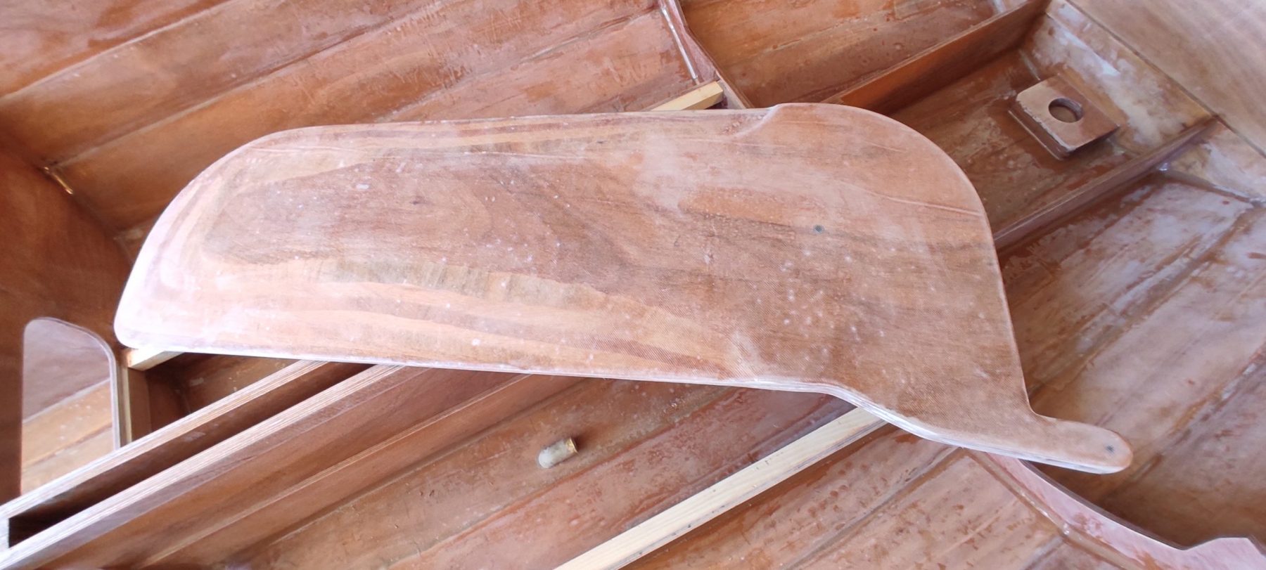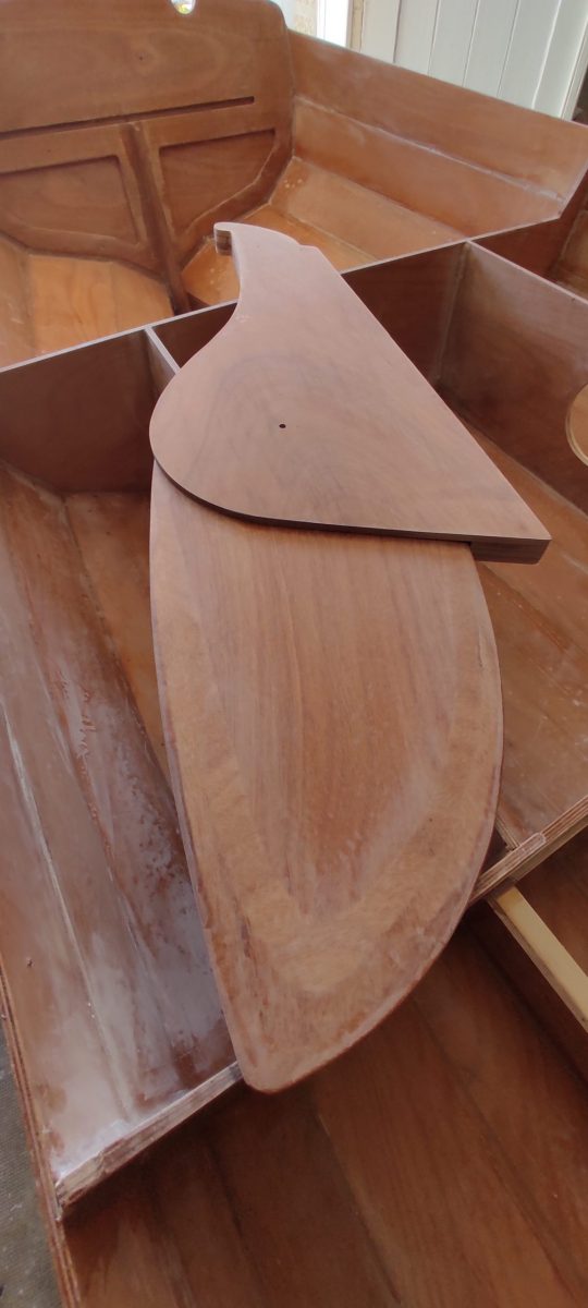 La dérive et la partie mobile du safran ont été profilées et stratifiées. J’ai aussi revu les nables de ballast qui étaient un peu trop hauts au premier encollage. On dit toujours que « le mieux est l’ennemi du bien », mais si ce n’est pas bien il ne faut pas hésiter à refaire.