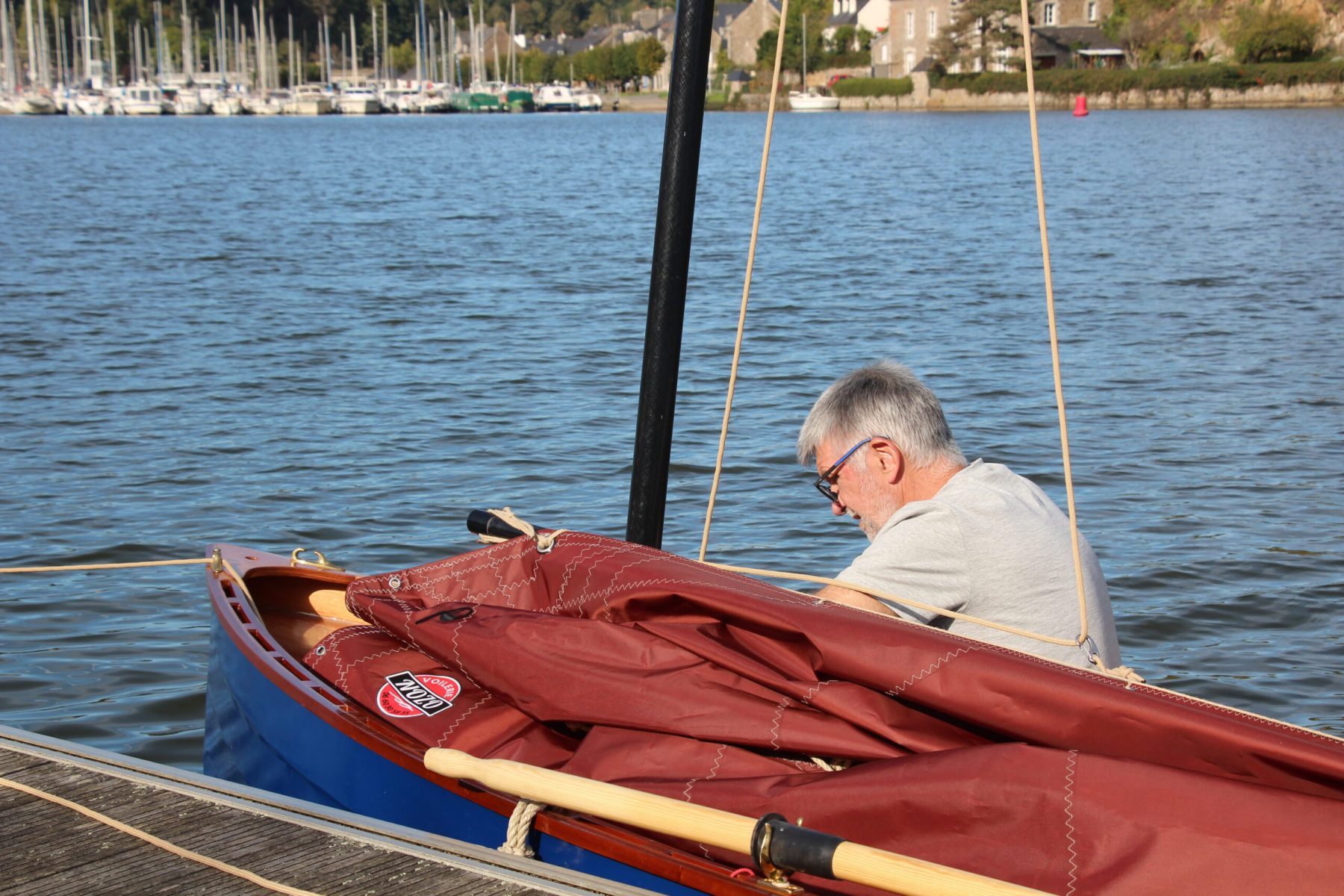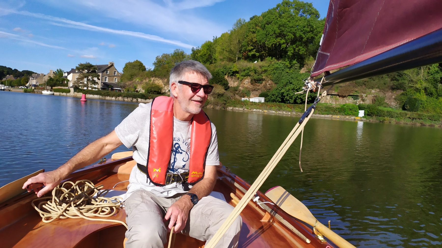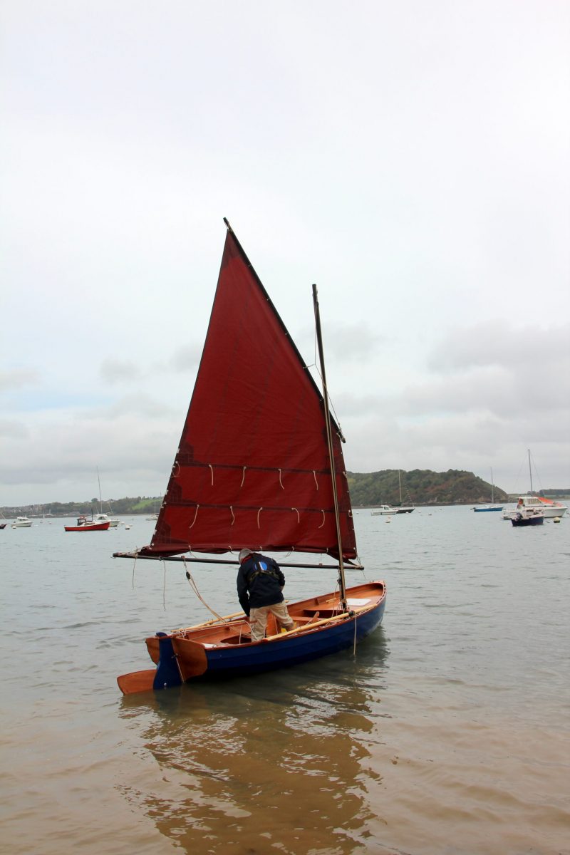 Cette fois j’ai réduit la toile, au prétexte de tester mon système de prise de ris et objectivement pour perdre en puissance. Seul à bord , peu toilé et ballasté, le bateau se comporte bien. Le vent est plus faible que prévu et je prends le temps d’apprécier cette navigation. Avec Denis, nous allons remonter la Rance pour passer les ponts Chateaubriand et St Hubert en tirant patiemment quelques bords.