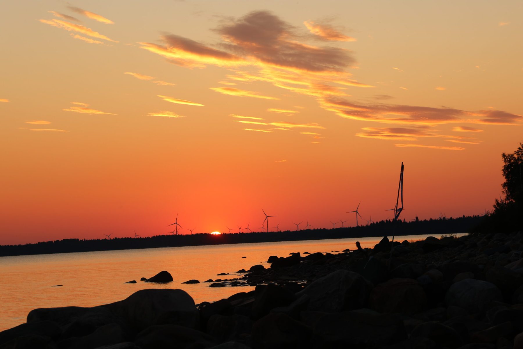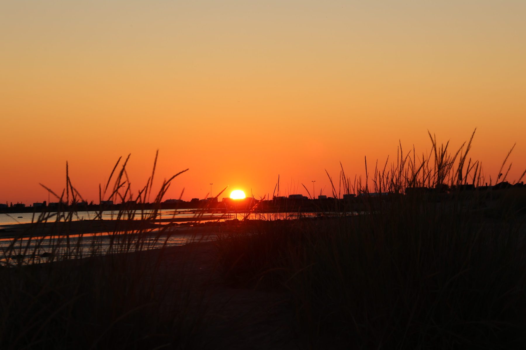 A Hietaniemi (65°05’N;024°44’E), sur l’île de Hailuoto, le soleil s’est couché à 23h13 le dimanche 21 juillet. Il s’est levé à 3h39 le lundi 23. Nous sommes à environ 180 kms au sud du cercle polaire et il n’est pas question ici de soleil de minuit mais 1 mois après le solstice, les nuits sont encore courtes. En fait de nuit, il n’y aura pas d’obscurité mais un long crépuscule qui prendra fin au lever du soleil.