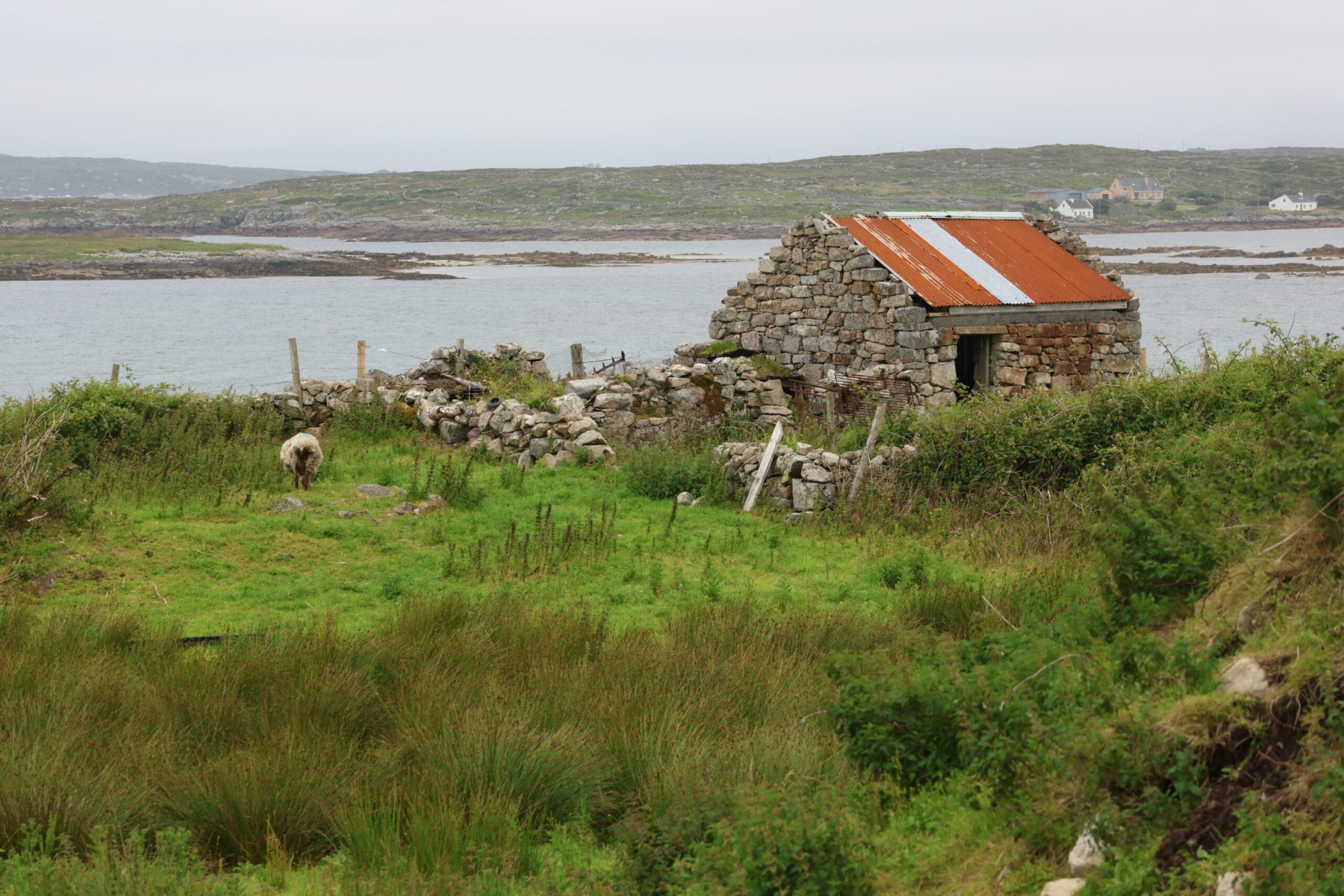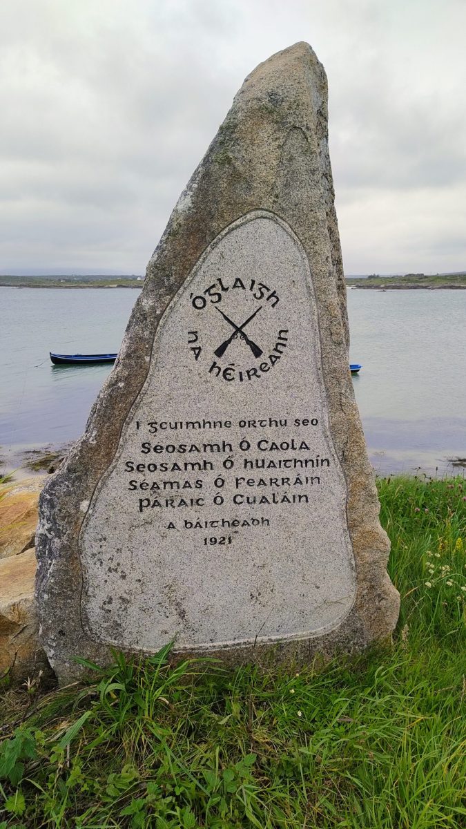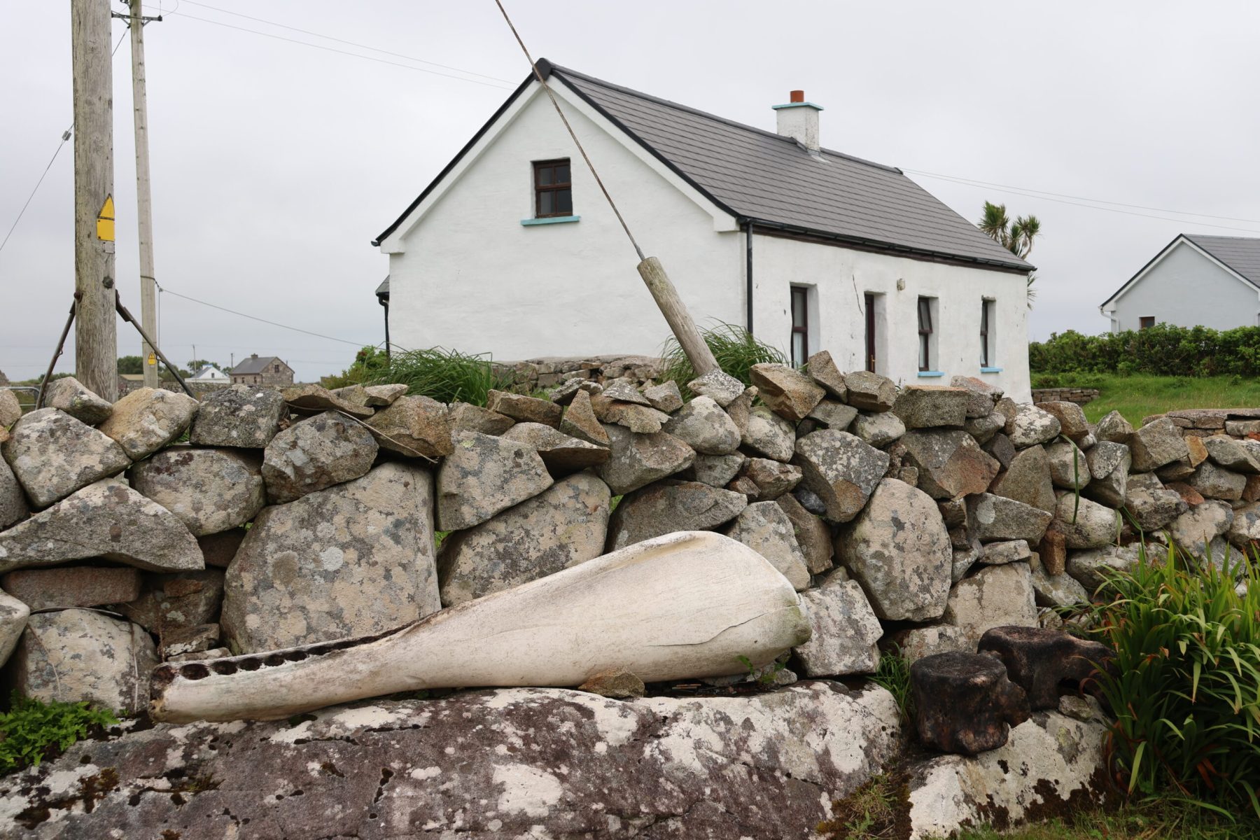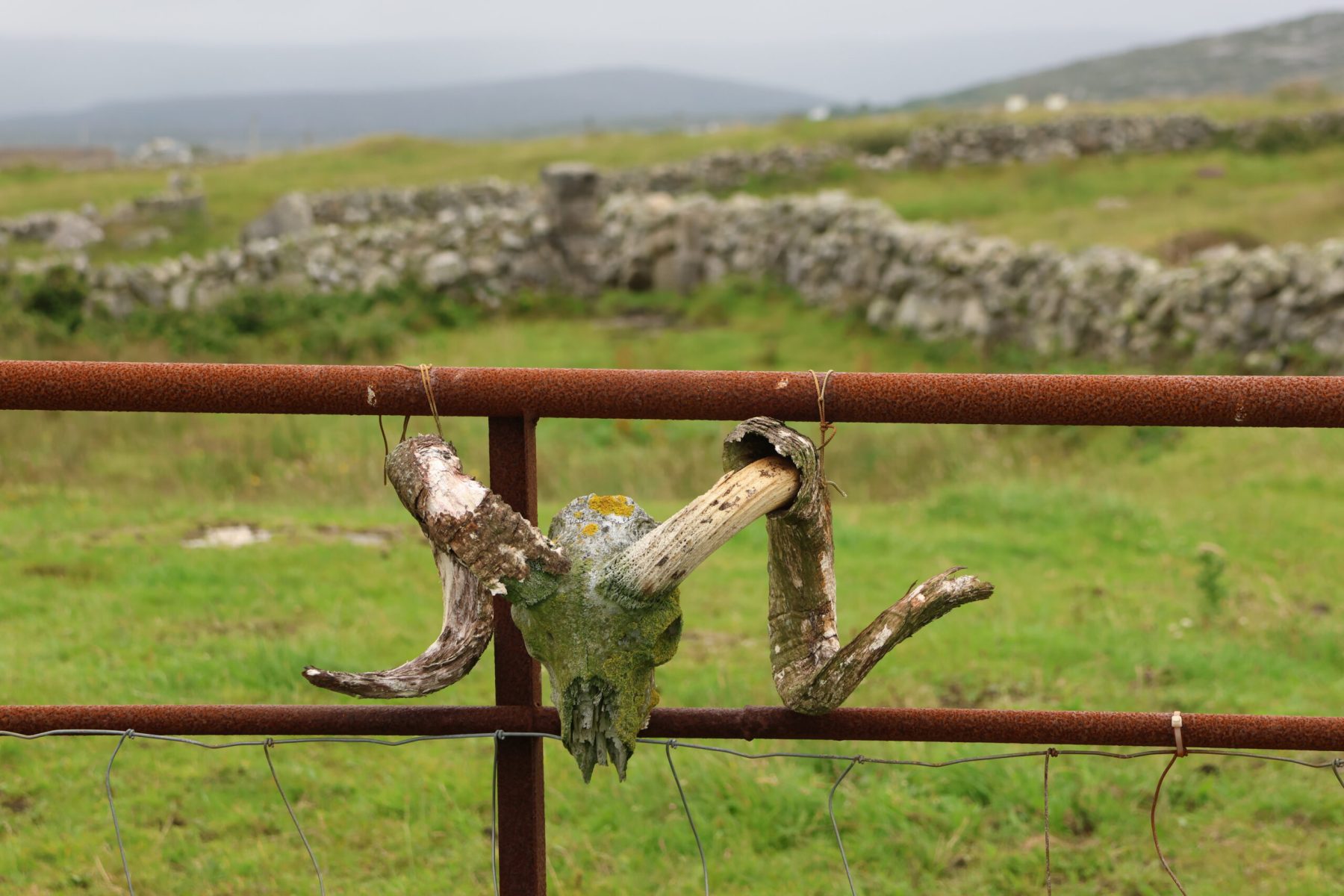 Une fois installés, nous partons pour la Moyrus loop. Au hasard de la boucle balisée qui suit le bord de mer et nous fait rentrer par les petites routes, nous notons : un monument aux héros de l’indépendance, un Eire Sign (le No52), quelques décorations originales, un crâne de bélier sur une clôture, une mâchoire et des vertèbres de cachalot sur un mur. De quoi alimenter notre album photo souvenir.