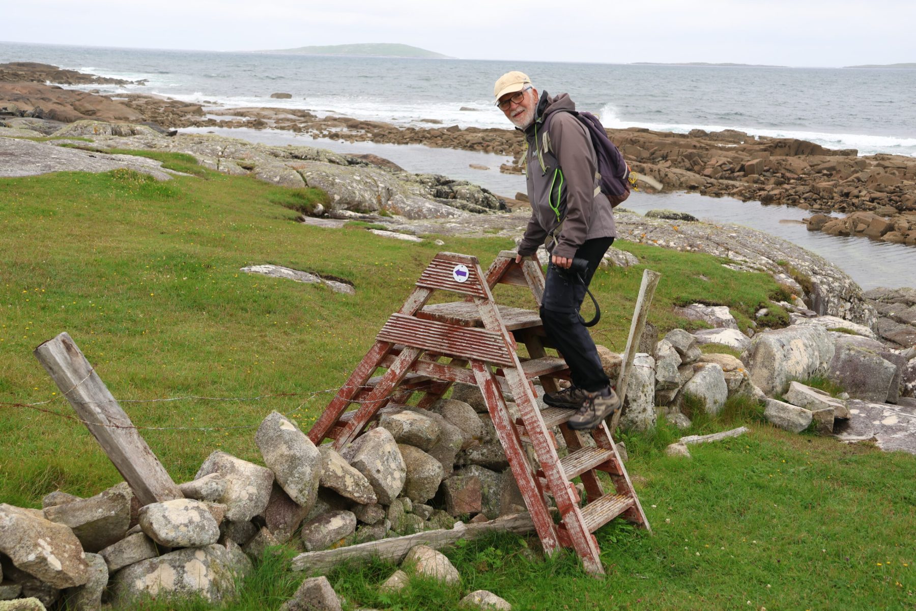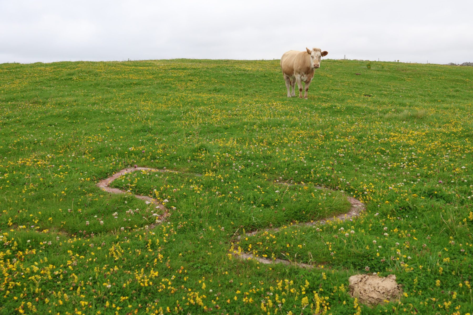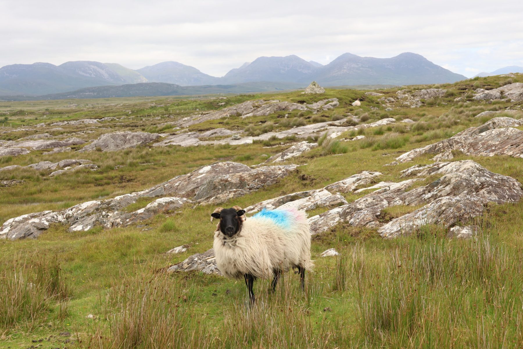 Une fois installés, nous partons pour la Moyrus loop. Au hasard de la boucle balisée qui suit le bord de mer et nous fait rentrer par les petites routes, nous notons : un monument aux héros de l’indépendance, un Eire Sign (le No52), quelques décorations originales, un crâne de bélier sur une clôture, une mâchoire et des vertèbres de cachalot sur un mur. De quoi alimenter notre album photo souvenir.