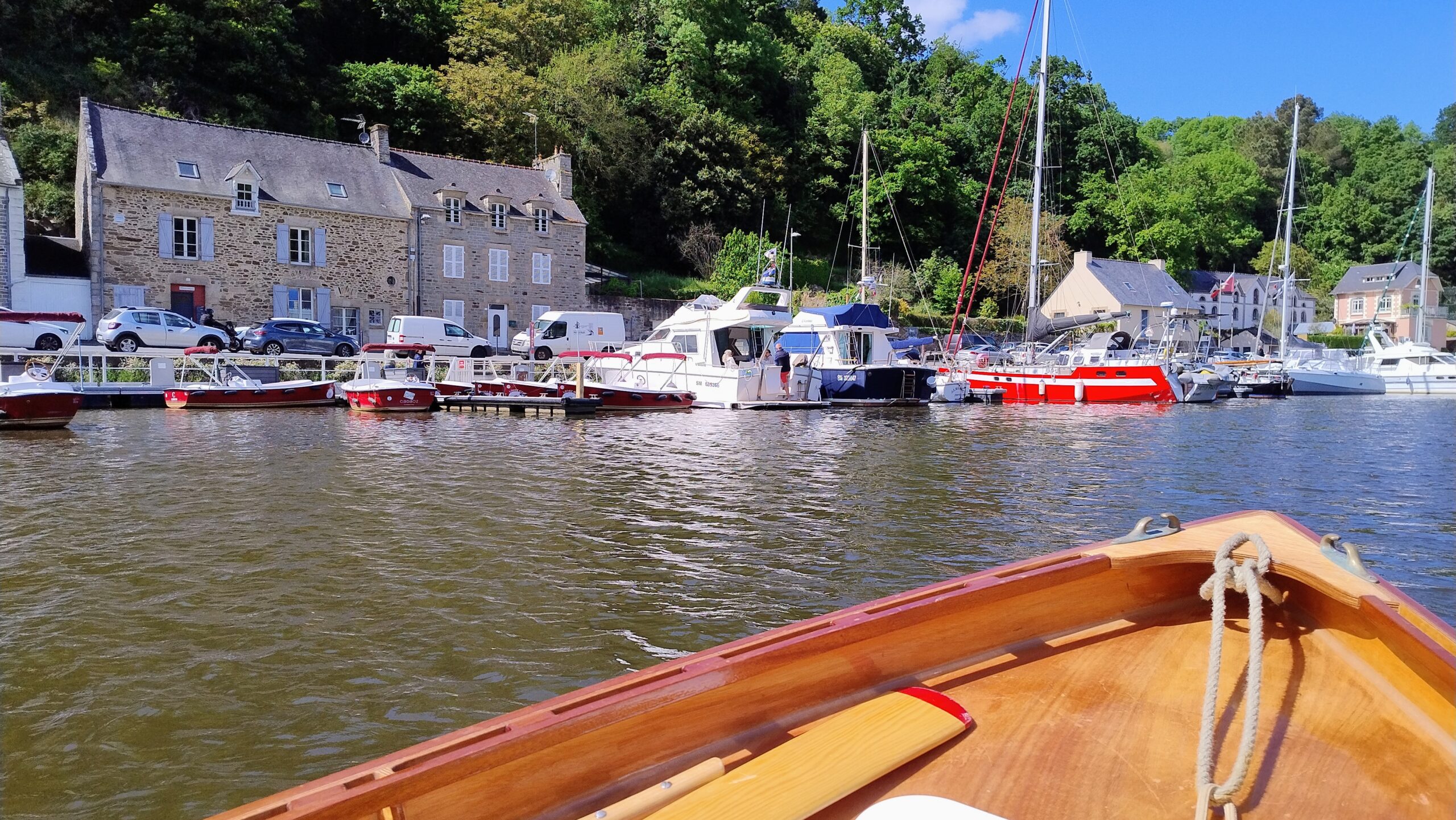 La remontée de la Rance vers Dinan se fait vent arrière à un peu plus de trois nœuds et après une courte escale au port, il fait vraiment froid en terrasse, nous repartons bout au vent vers notre point de départ.