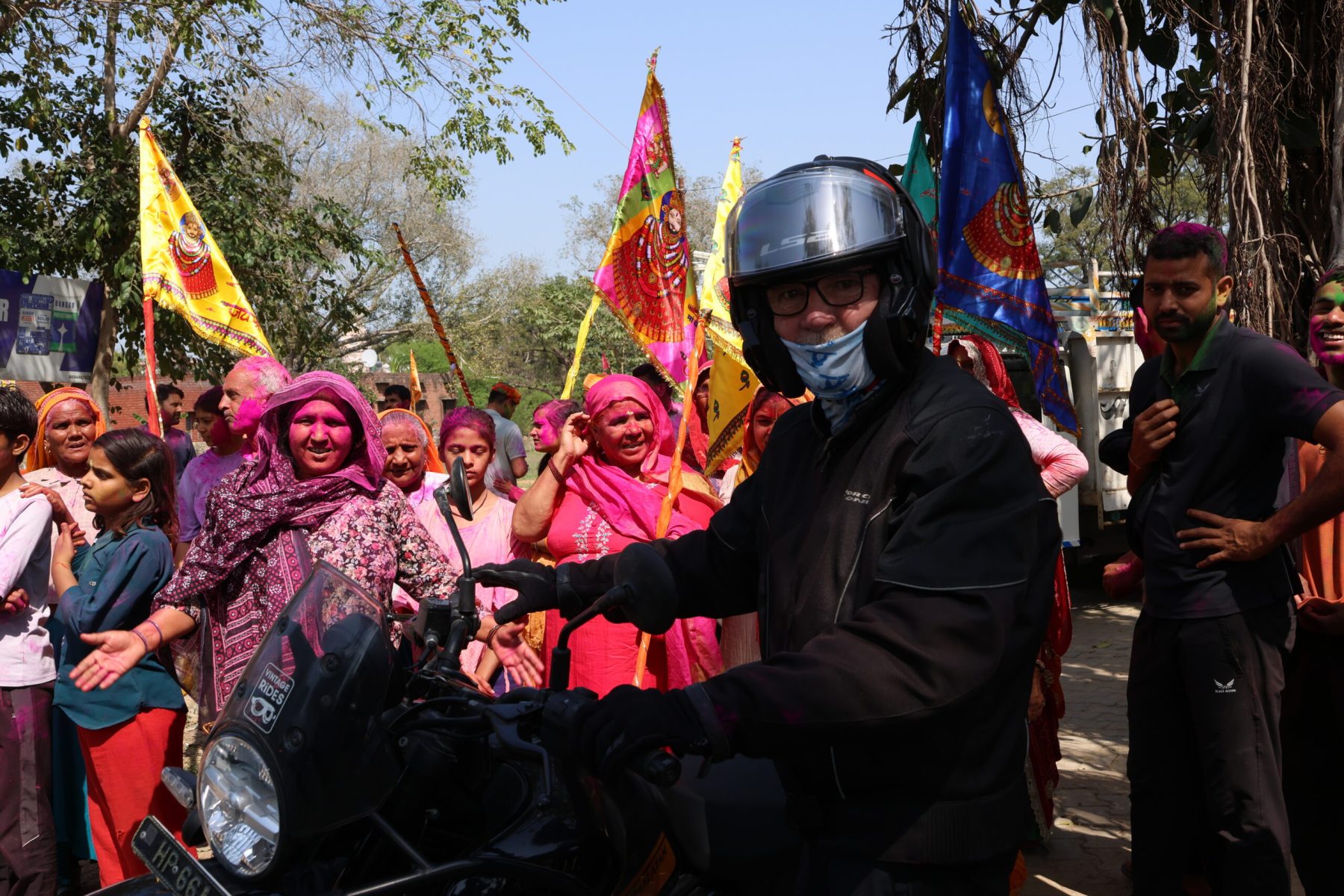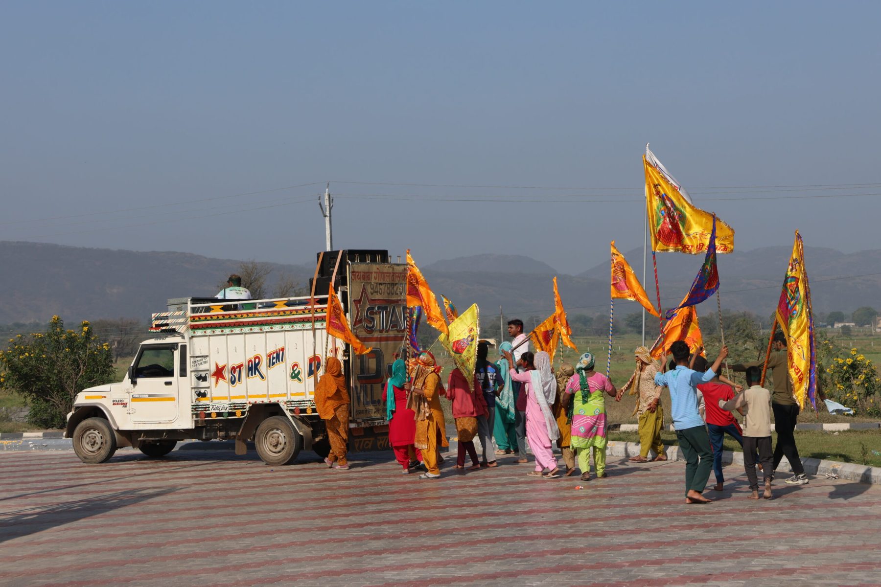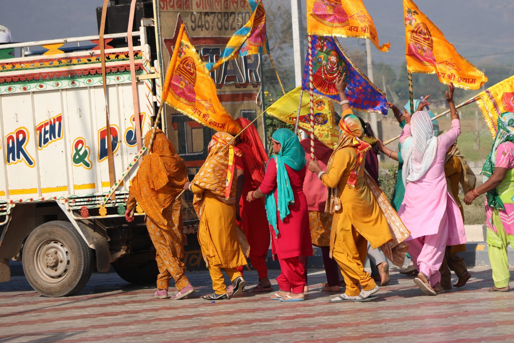 Sur la route, nous doublons beaucoup de groupes de pèlerins qui préparent Holi, la fête hindoue des couleurs, à grand renfort de sonos assourdissantes, de bannières dorées et de poudres colorées.