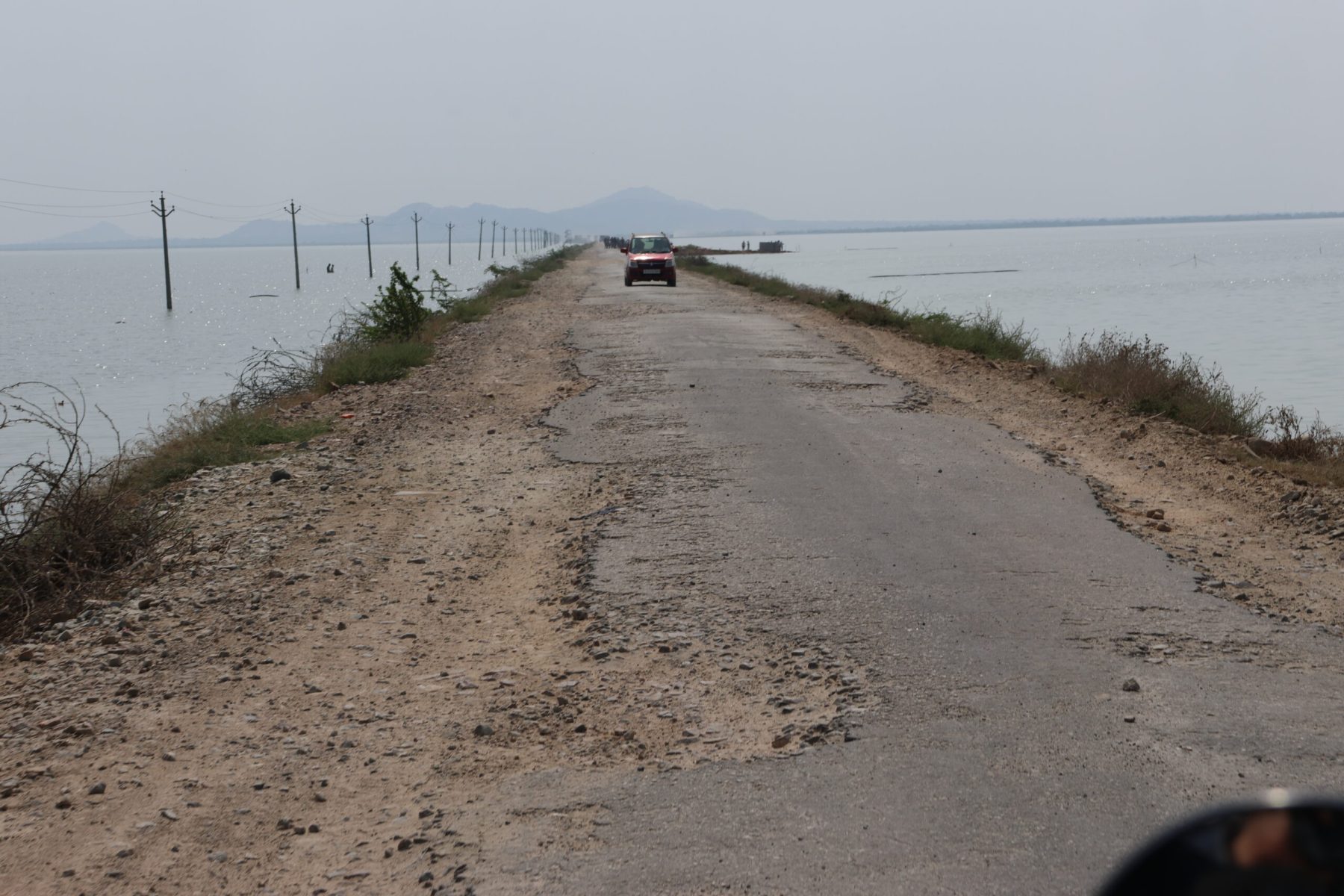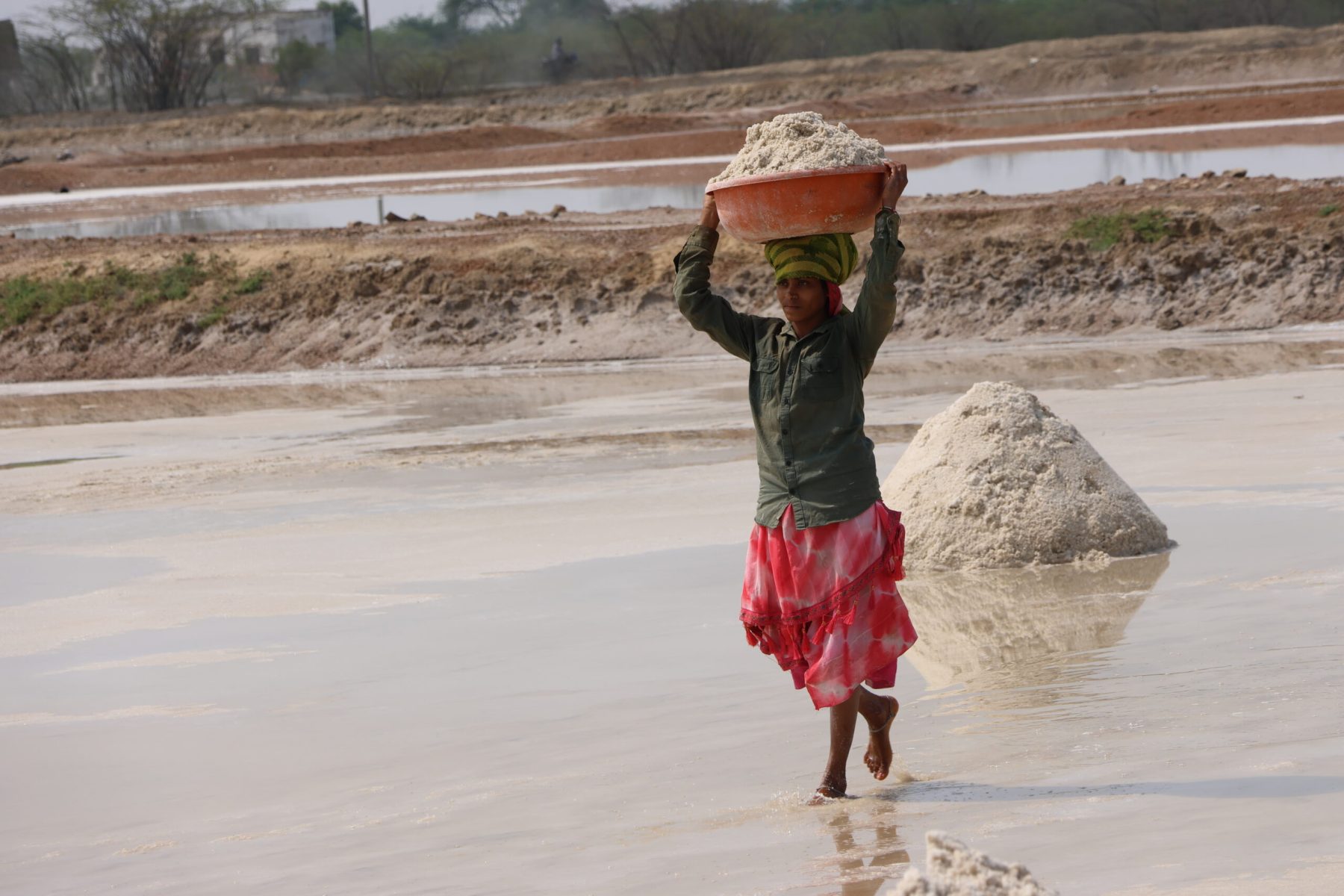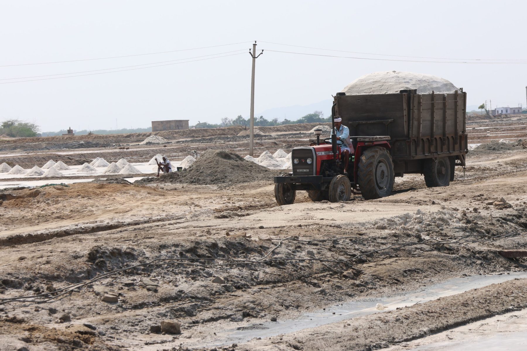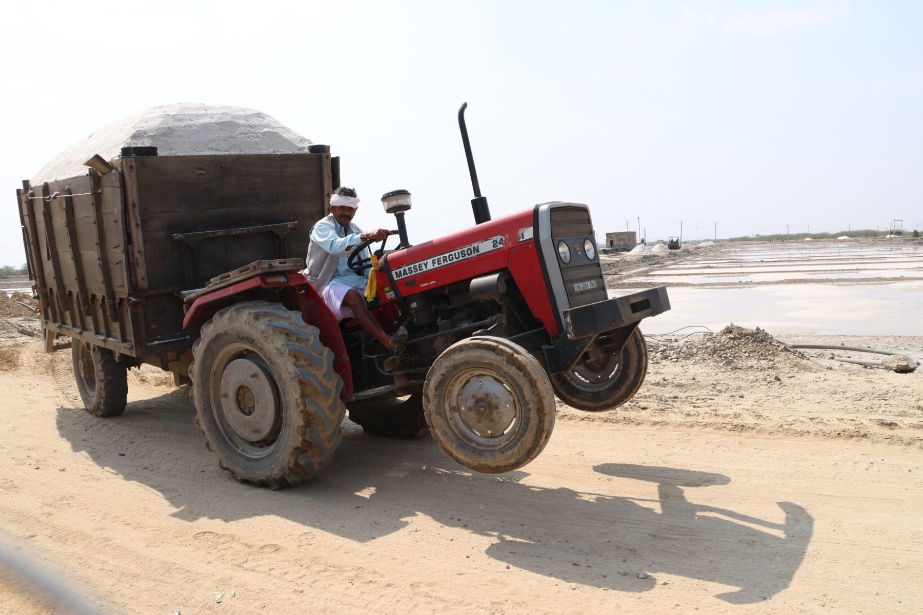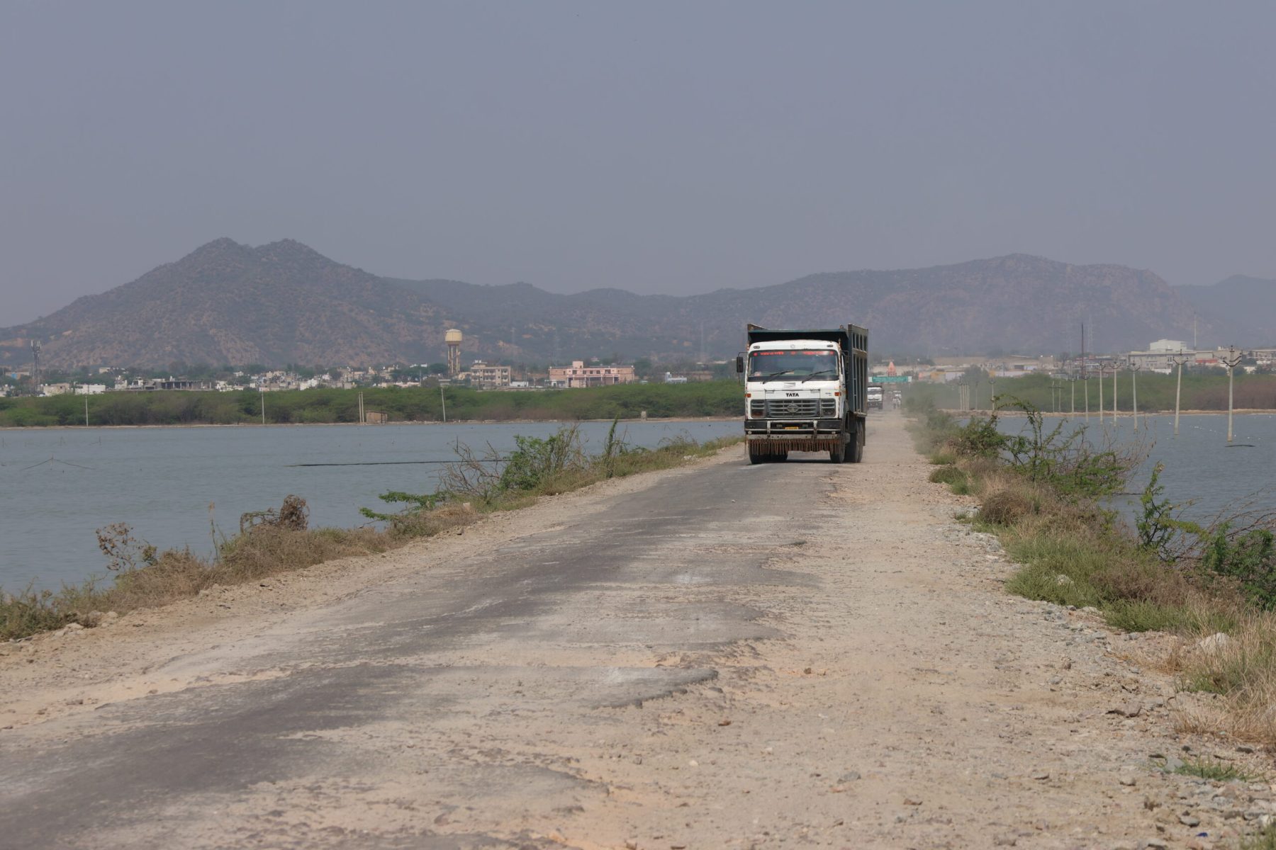Le meilleur chemin n’est pas toujours la ligne droite. Notre itinéraire tout terrain nous amène au lac salé de Shambhar au Nord Est de Pushkar. Sur la route défoncée qui coupe le lac en deux, nous croisons des camions chargés à barroter de sel. La rencontre se fait à la mode locale. Tout le monde choisi sa place, personne ne s’arrête.